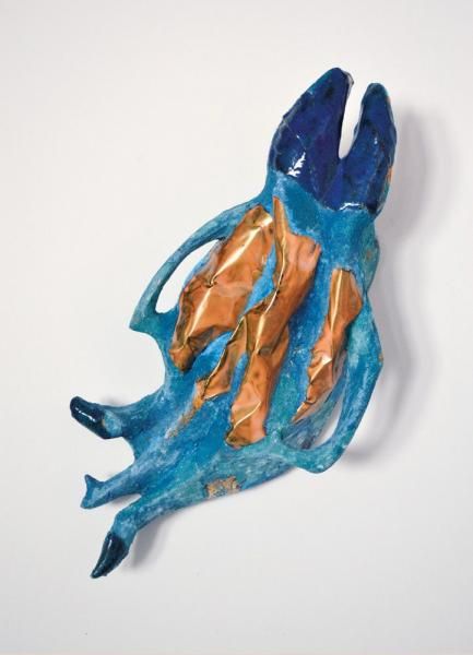 Wandplastiken aus der Serie "Im Fluss" werden aus dem von mir entwickelten Material Papierstein® modelliert, in dem die Beständigkeit des Steins mit der Vergänglichkeit des Papiers vereint sind. In diese lebendig wirkenden Plastiken sind emaillierte-Kupferformen eingearbeitet, die in ihrer glänzenden, glatten Oberfläche durch das Element Metall den Kontrast zum Papierstein® bilden und den Höhepunkt in den Plastiken darstellen.