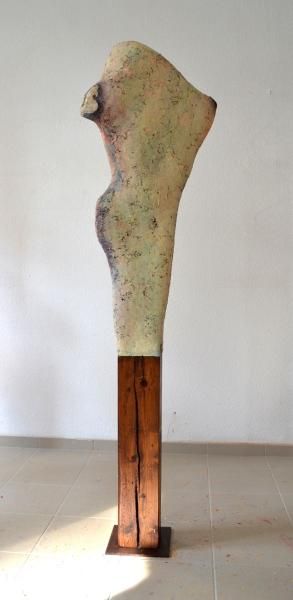 Inspiriert von den Mégalithen, setze ich mich plastisch mit der Thematik der Steinkreise auseinander und finde zu neuen organischen Formen, die aus Holzstehlen emporsteigen. Die organischen Figuren entstehen aus dem von mir entwickelten Material Papierstein®, in dem die Beständigkeit des Steins mit der Vergänglichkeit des Papiers vereint sind. In diese lebendig wirkenden Plastiken sind Steine eingefasst, die den Bezug zur ursprünglichen Inspirationsquelle deutlich machen. “Mégalith“, 2012; eine Installation mit 24 Plastiken,