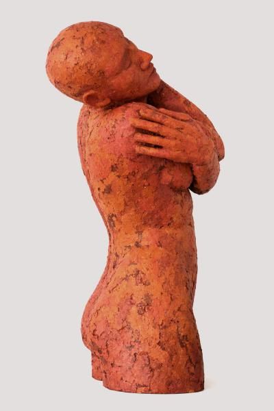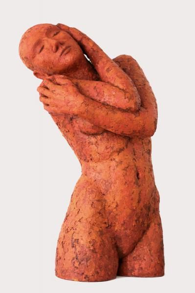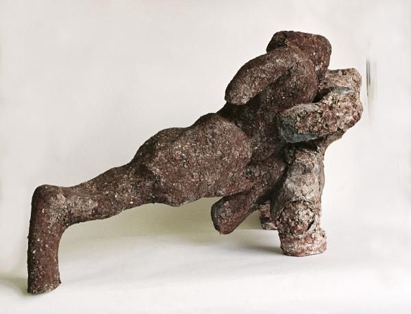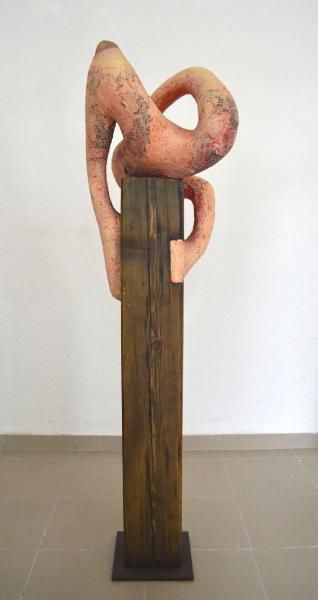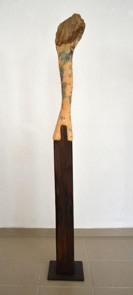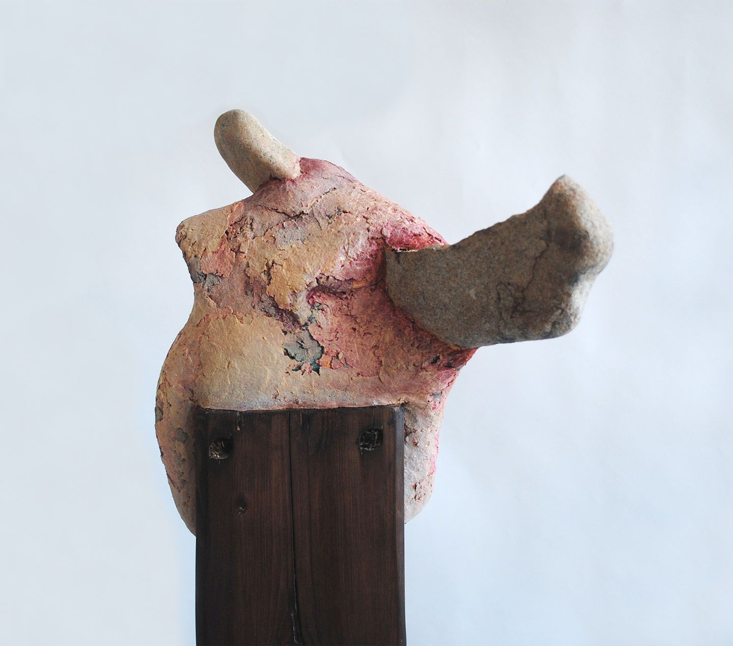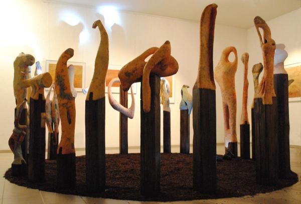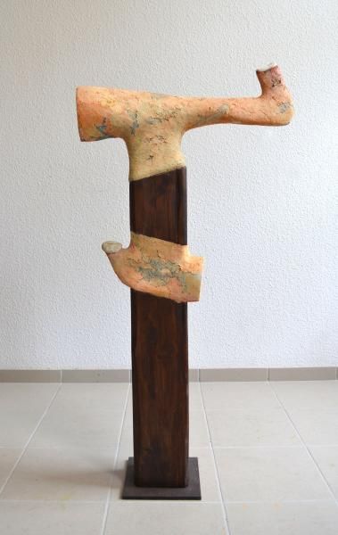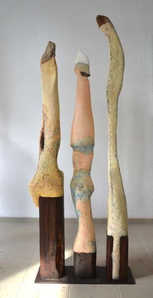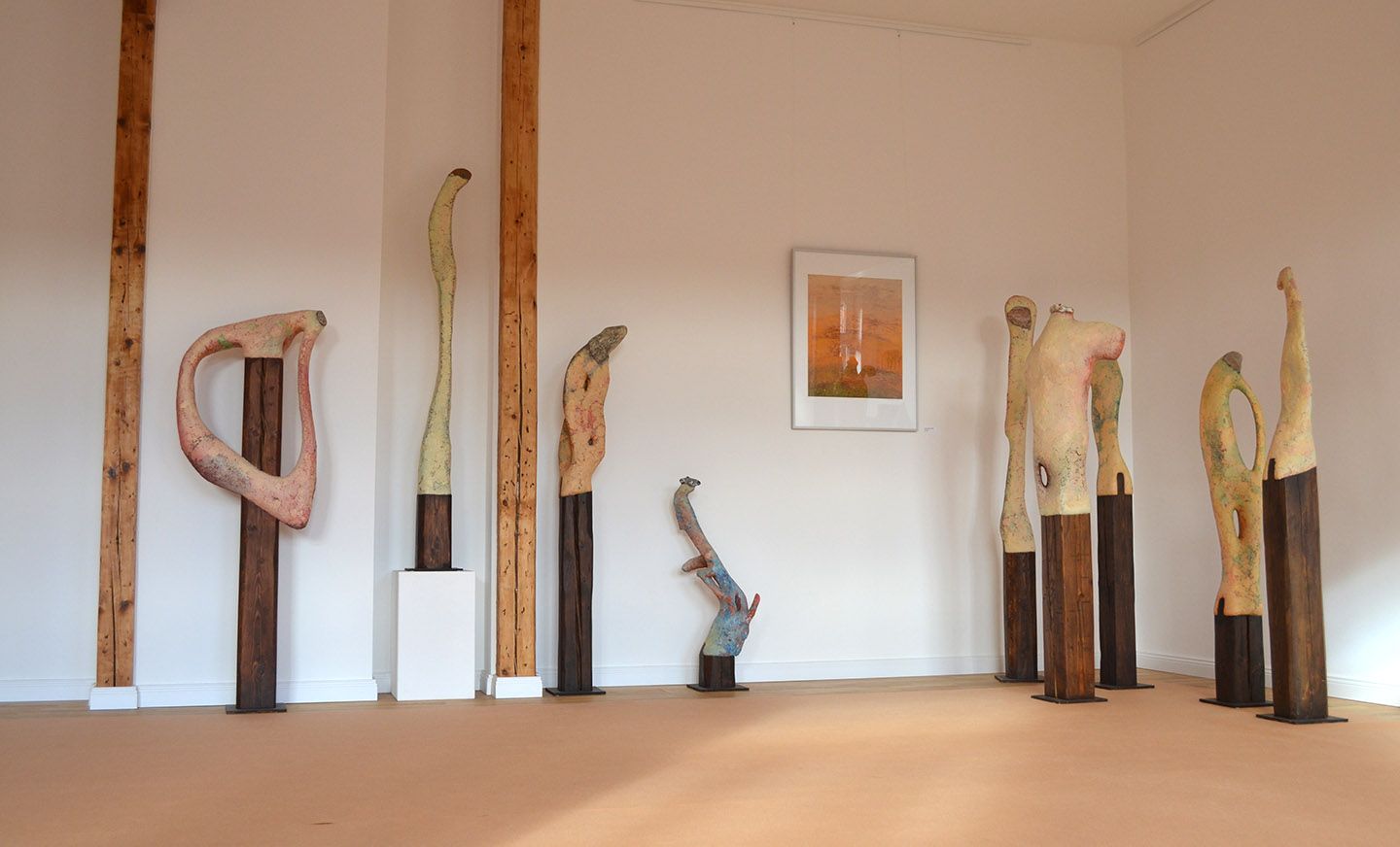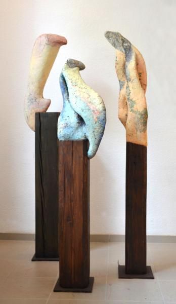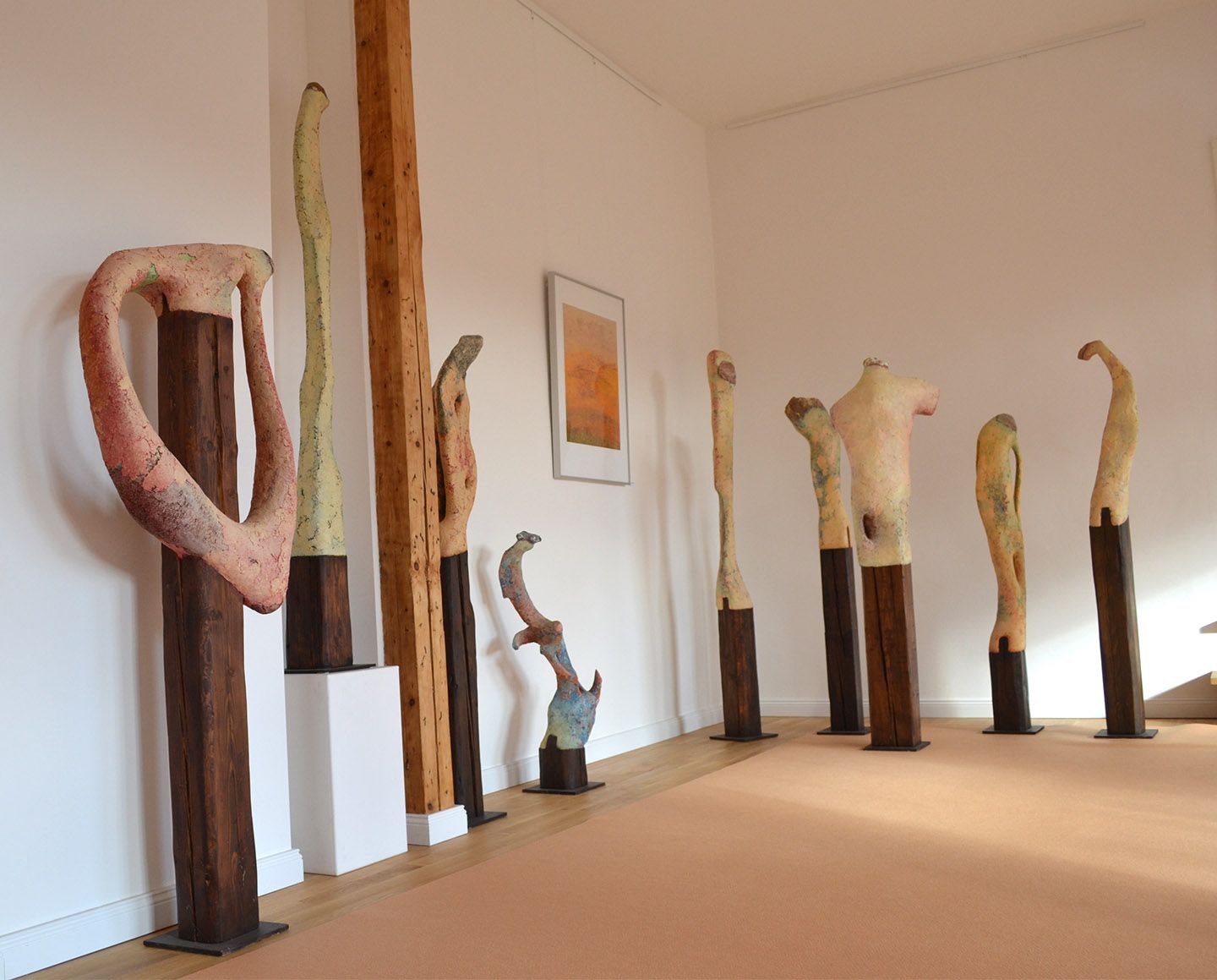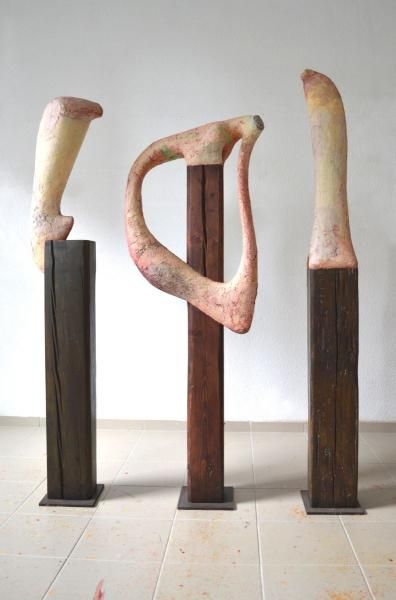 Inspiriert von den Mégalithen, setze ich mich plastisch mit der Thematik der Steinkreise auseinander und finde zu neuen organischen Formen, die aus Holzstehlen emporsteigen. Die organischen Figuren entstehen aus dem von mir entwickelten Material Papierstein®, in dem die Beständigkeit des Steins mit der Vergänglichkeit des Papiers vereint sind. In diese lebendig wirkenden Plastiken sind Steine eingefasst, die den Bezug zur ursprünglichen Inspirationsquelle deutlich machen. “Mégalith“, 2012; eine Installation mit 24 Plastiken,