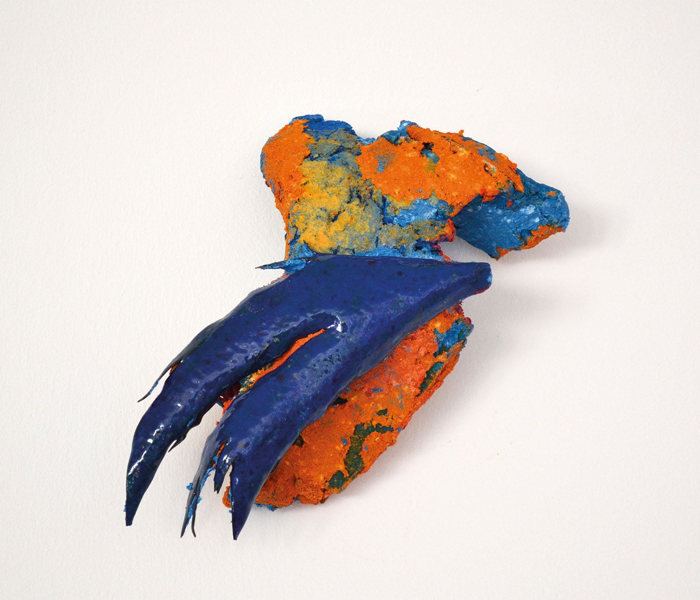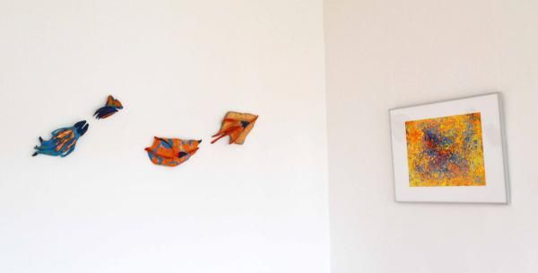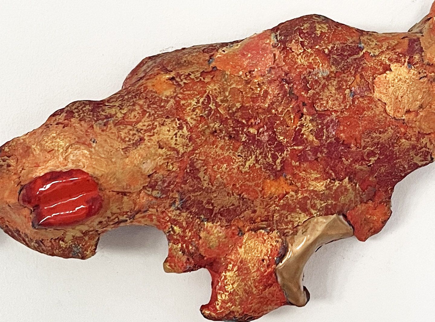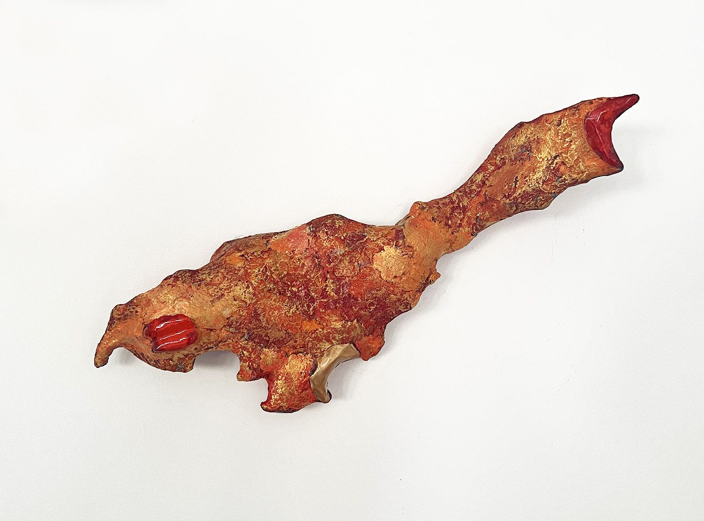 My wallsculptures are modeled with Papierstein®/PaperStone, a trademark material developed by myself. Actual I embedded in my sculptures enameled copper shapes. The metal creates a shiny contrast to the rather rugged Papierstein® material.