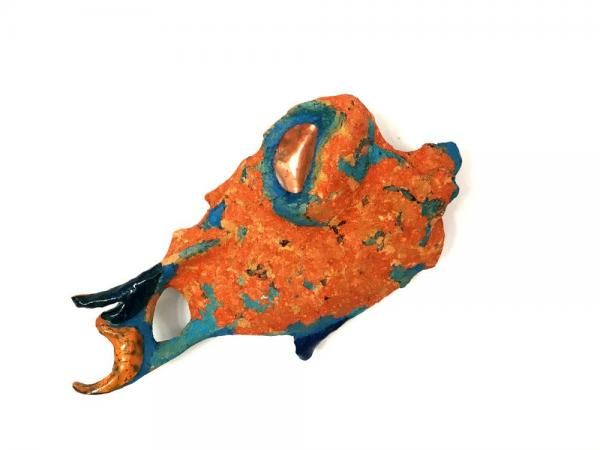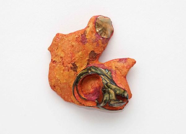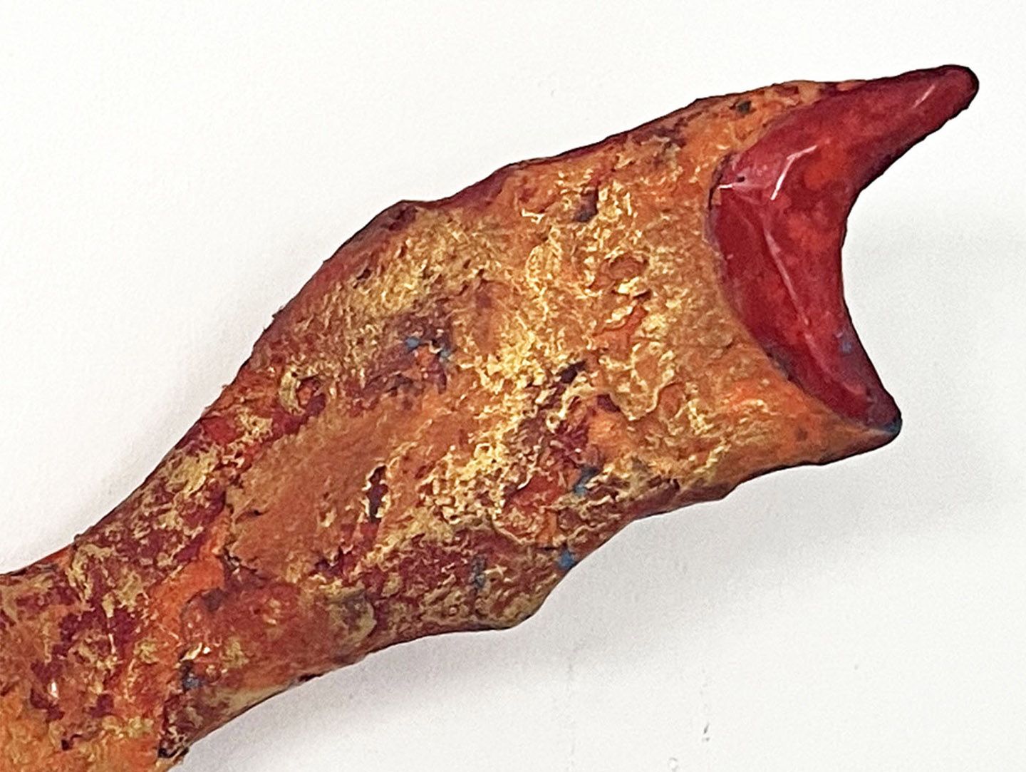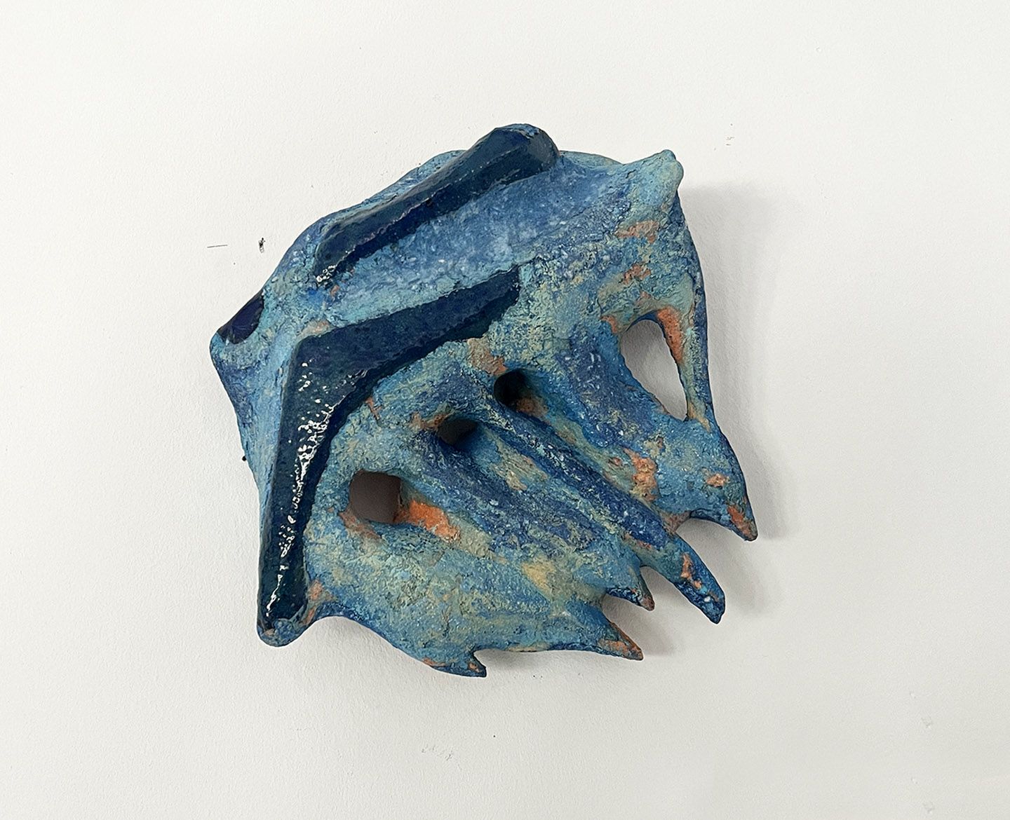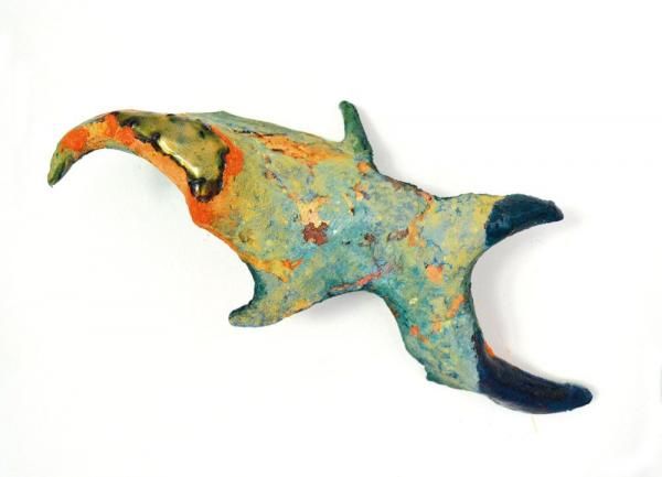 My wallsculptures are modeled with Papierstein®/PaperStone, a trademark material developed by myself. Actual I embedded in my sculptures enameled copper shapes. The metal creates a shiny contrast to the rather rugged Papierstein® material.