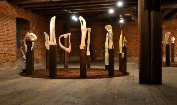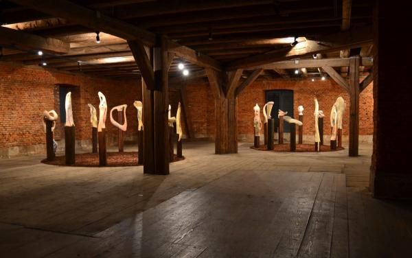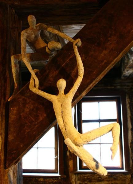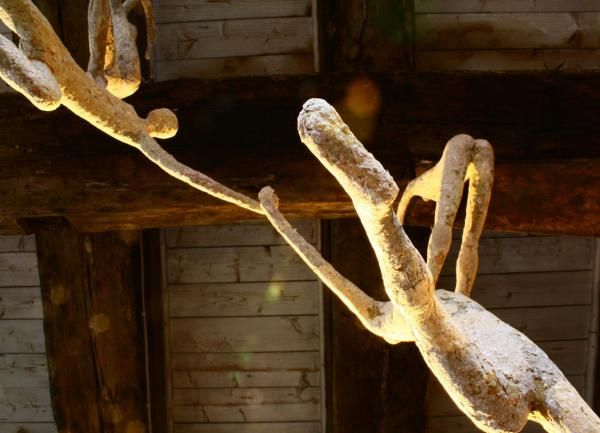 Eine Rauminstallation mit 33 Figuren, die an alten Holzbalken emporstreben.