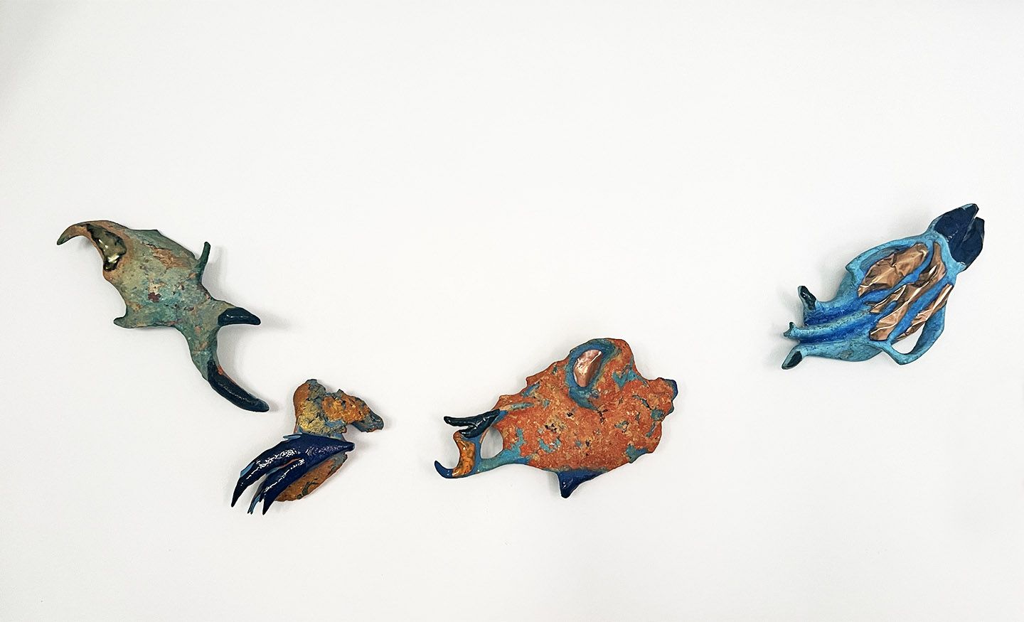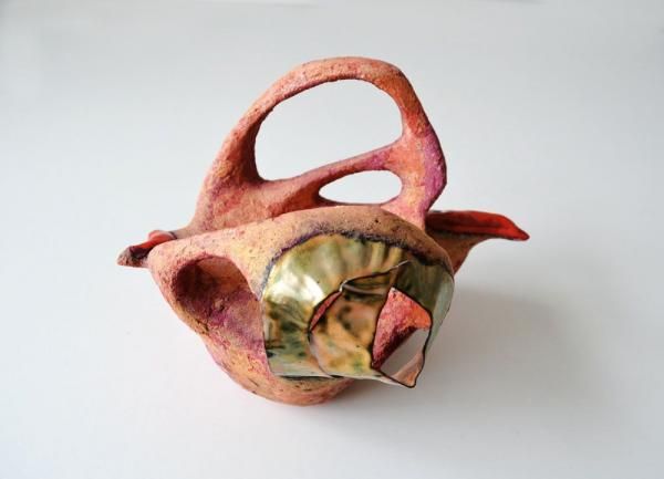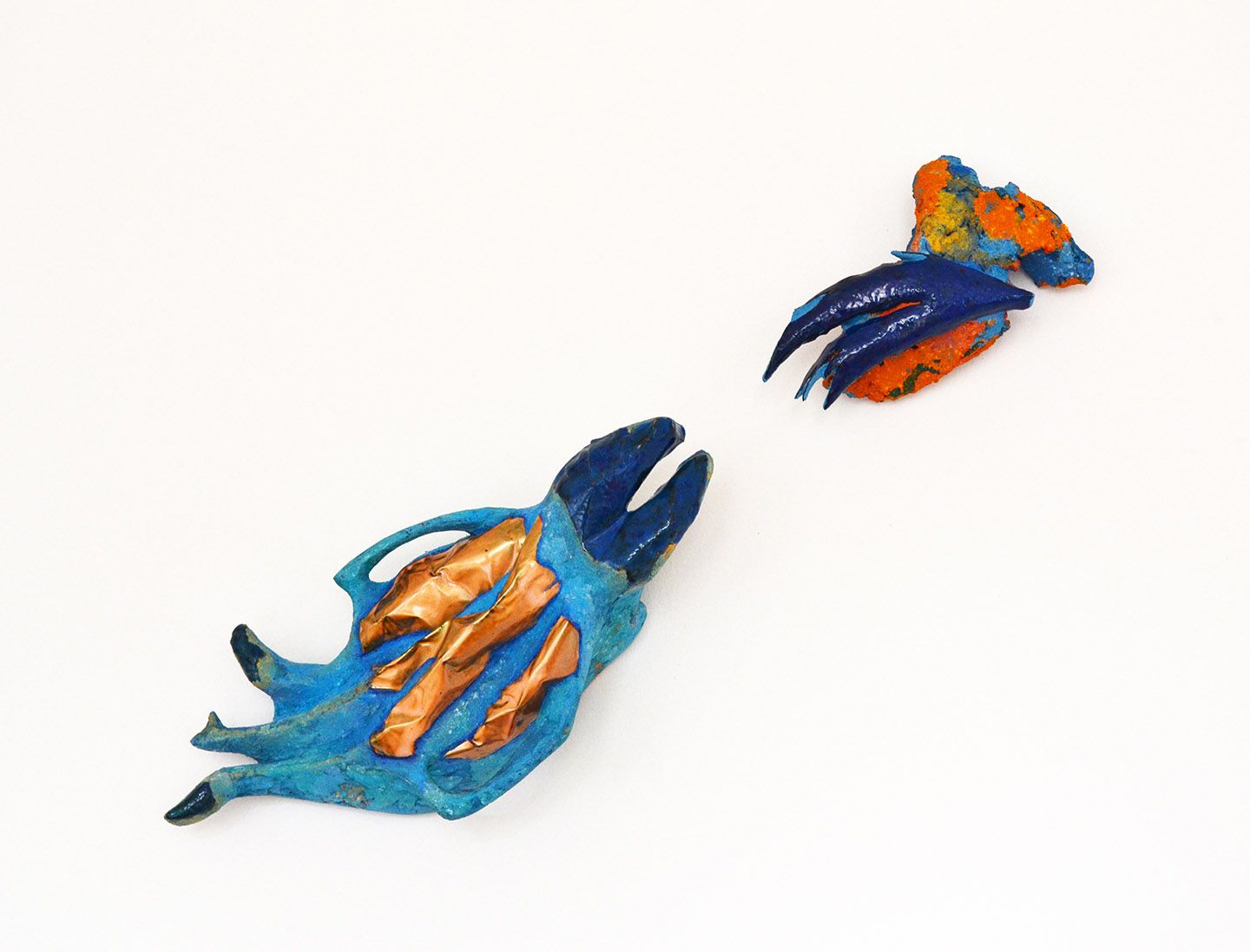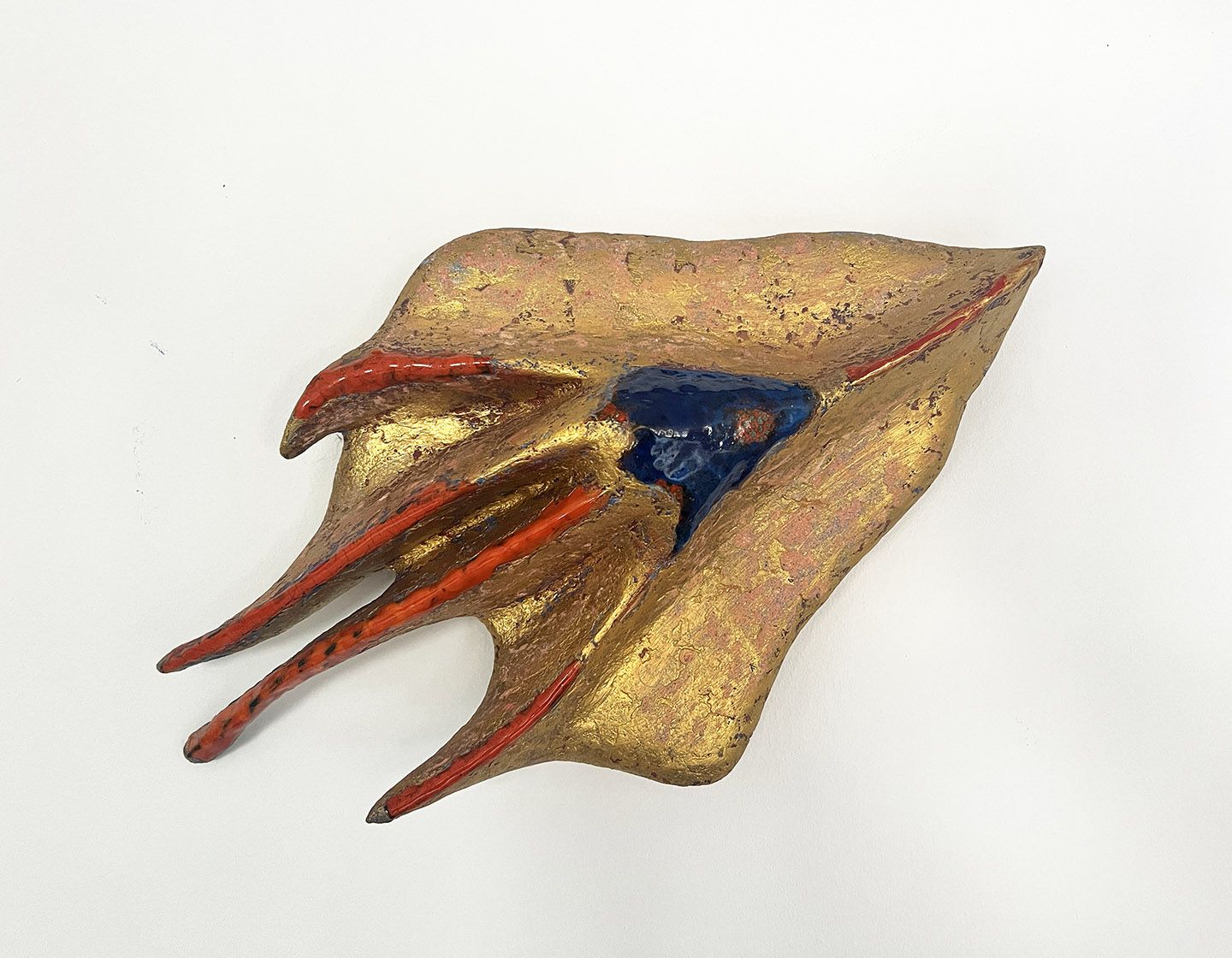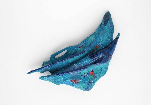 Wandplastiken aus der Serie "Im Fluss" werden aus dem von mir entwickelten Material Papierstein® modelliert, in dem die Beständigkeit des Steins mit der Vergänglichkeit des Papiers vereint sind. In diese lebendig wirkenden Plastiken sind emaillierte-Kupferformen eingearbeitet, die in ihrer glänzenden, glatten Oberfläche durch das Element Metall den Kontrast zum Papierstein® bilden und den Höhepunkt in den Plastiken darstellen.