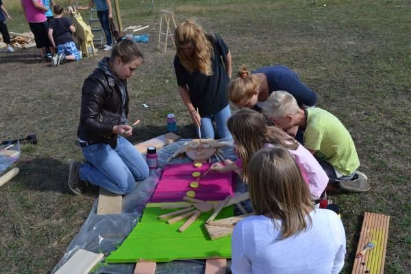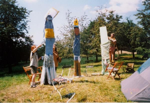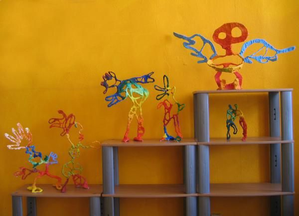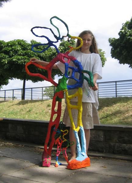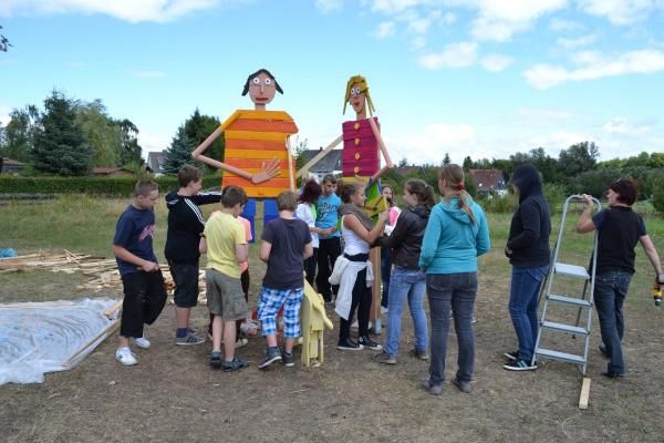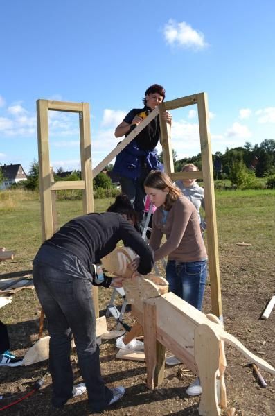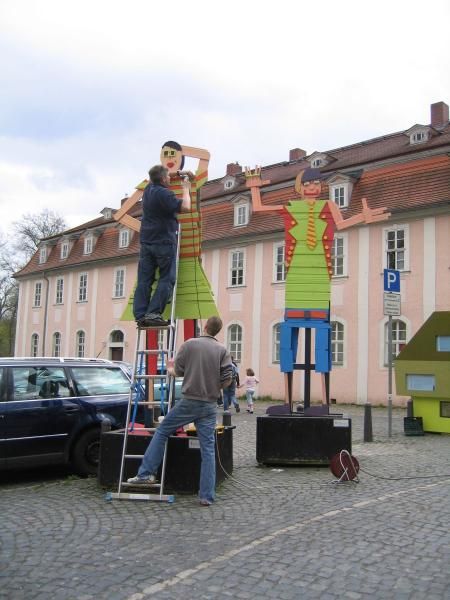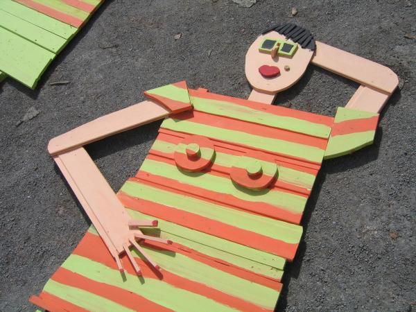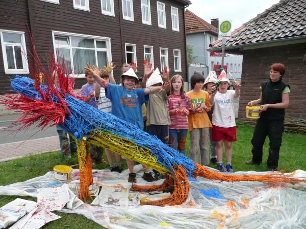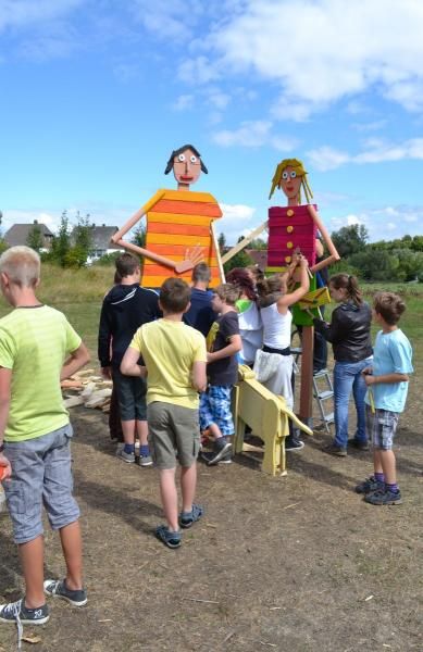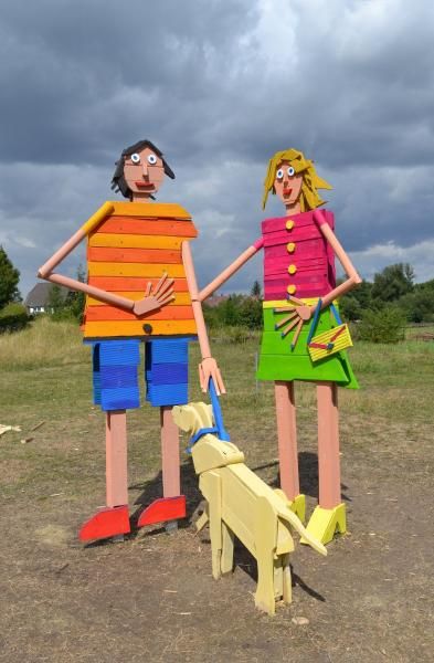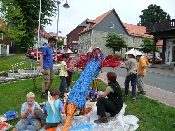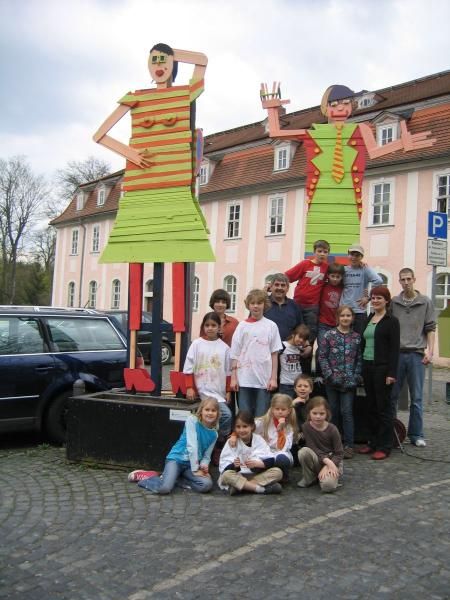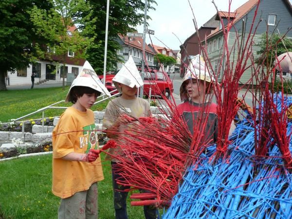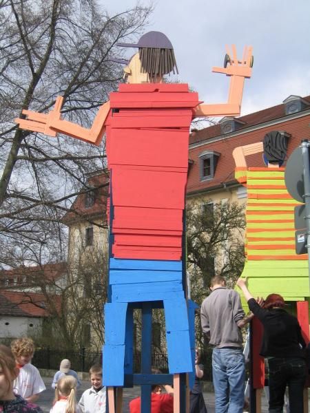 Überlebensgroße Holzplastiken entstanden in 3-4-tägigen Kunstprojekten in Bad Harzburg an der Haupt- und Realschule und an der Weimarer Malschule. Frei nach der Fantasie der Schüler wurden überlebensgroße Holzplastiken, in kreativer Teamarbeit mit verschiedenen Holzbrettern, Stäben, Stücken etc. zusammengenagelt, bis zwei Figuren entstanden, die durch die abschließende farbige Gestaltung Blickfang für den Schulhof und die Umgebung sind.