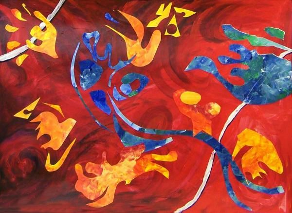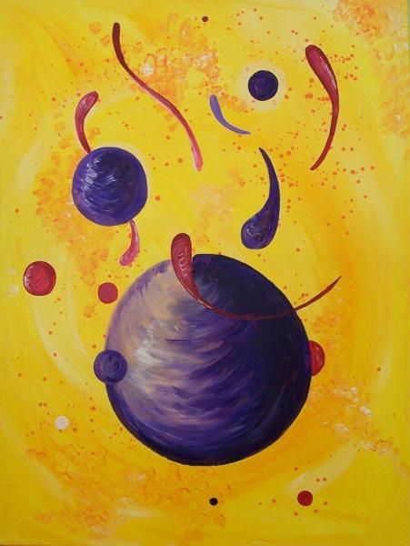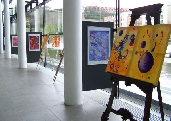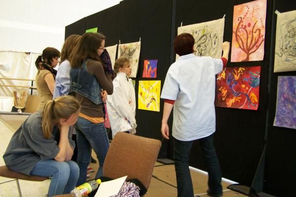 Im Rahmen des 4-tägigen Musik-Kunstprojektes fertigten Schülerinnen Malereien und grafische Arbeiten zu Mozarts „Jupiter-Sinfonie“, die anschließend im Foyer des Theaters präsentiert wurden. Im Vordergrund des künstlerischen Arbeitens stand die Visualisierung von Musik – das experimentelle Erarbeiten von Farben und Formen durch Interaktion zwischen Tönen und Klängen. Hierzu wurden die Proben des Erfurter Sinfonieorchesters besucht. Kleine Skizzen entstanden schon beim ersten Zuhören. Beziehungen zwischen Tönen und Farben wurden herauskristallisiert, eine Klangfarbe, ein Klangteppich mit lauten und leisen Tönen, in verschiedenen Farbabstufungen. In der synästhetischen Wahrnehmung gibt es viele Möglichkeiten, eine Melodie visuell umzusetzen. Die Konzentration bei der malerisch-grafischen Umsetztung lag auf dem wiederholten Hören der einzelnen Musikstücke und Sätze innerhalb der Sinfonie, die den Rhythmus, die Tonart, die Höhe und Tiefe der Klänge, die Stimmung der Instrumente vorgaben, welche individuell auf die Zuhörerinnen einwirkten. So entstanden verschiedene Formen, wie bspw. Kreise, Rechtecke, Linien, Punkte und Schwünge in den unterschiedlichsten Farben auf einem Bildteppich.